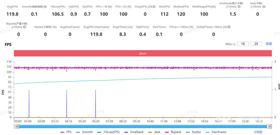 在《原神》的测试中,开启极高画质+60帧的模式,红魔10S Pro还可以通过插帧的方式实现120帧的游戏帧率,在须弥城跑图过程中,经过PerfDog进行测试,平均帧率可以达到119.8FPS,同样具备满帧游戏的能力。