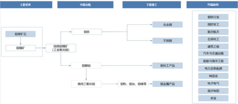 作为一种重要的不可再生的稀缺性战略资源,以其独特的性能通过含钼不锈钢、含钼合金钢、钼金属及钼化工产品等形态最终可应用于包括钢铁行业、石油化工、建筑工程、汽车与交通运输、船舶及海洋工程、医疗制药、农业等传统行业。