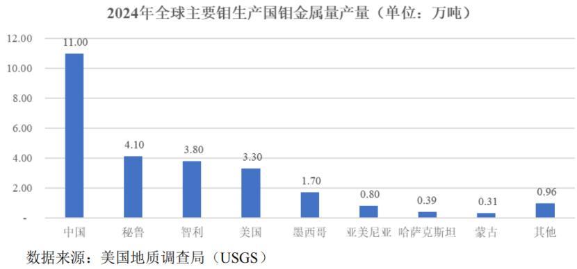 根据美国地质调查局(USGS)统计数据,2024年全球预计钼金属产量约26万吨,其中,中国、秘鲁、智利、美国和墨西哥的产量总和约占全球总产量的90.67%。