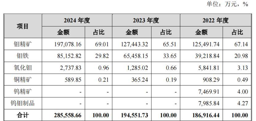 报告期内,钼精矿和钼铁的收入合计占公司主营业务收入的比例分别为88.12%、99.15%和98.83%。