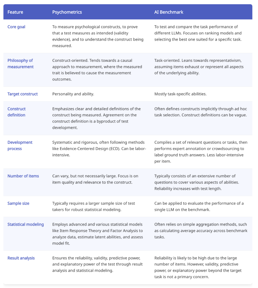 而心理测量学则以「构念」为核心,追求对心理特质的深入理解,强调测试项目的科学设计和解释力,采用如项目反应理论(IRT)等先进统计方法,力求让测试结果既可靠又具备预测力,能够揭示个体在多样认知任务中的表现规律。 正是基于这种理念的转变,研究者们提出了三大创新方向。