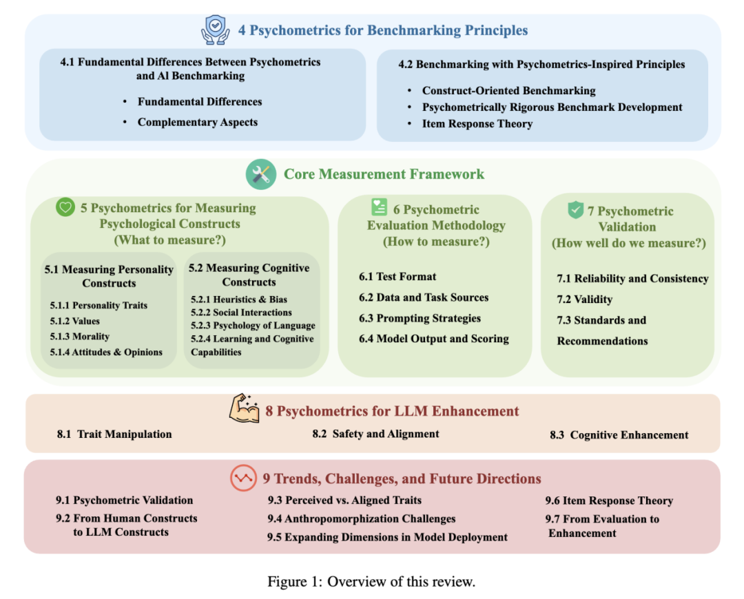 这篇综述论文首次系统梳理了 LLM 心理测量学的研究进展,结构如下图所示。