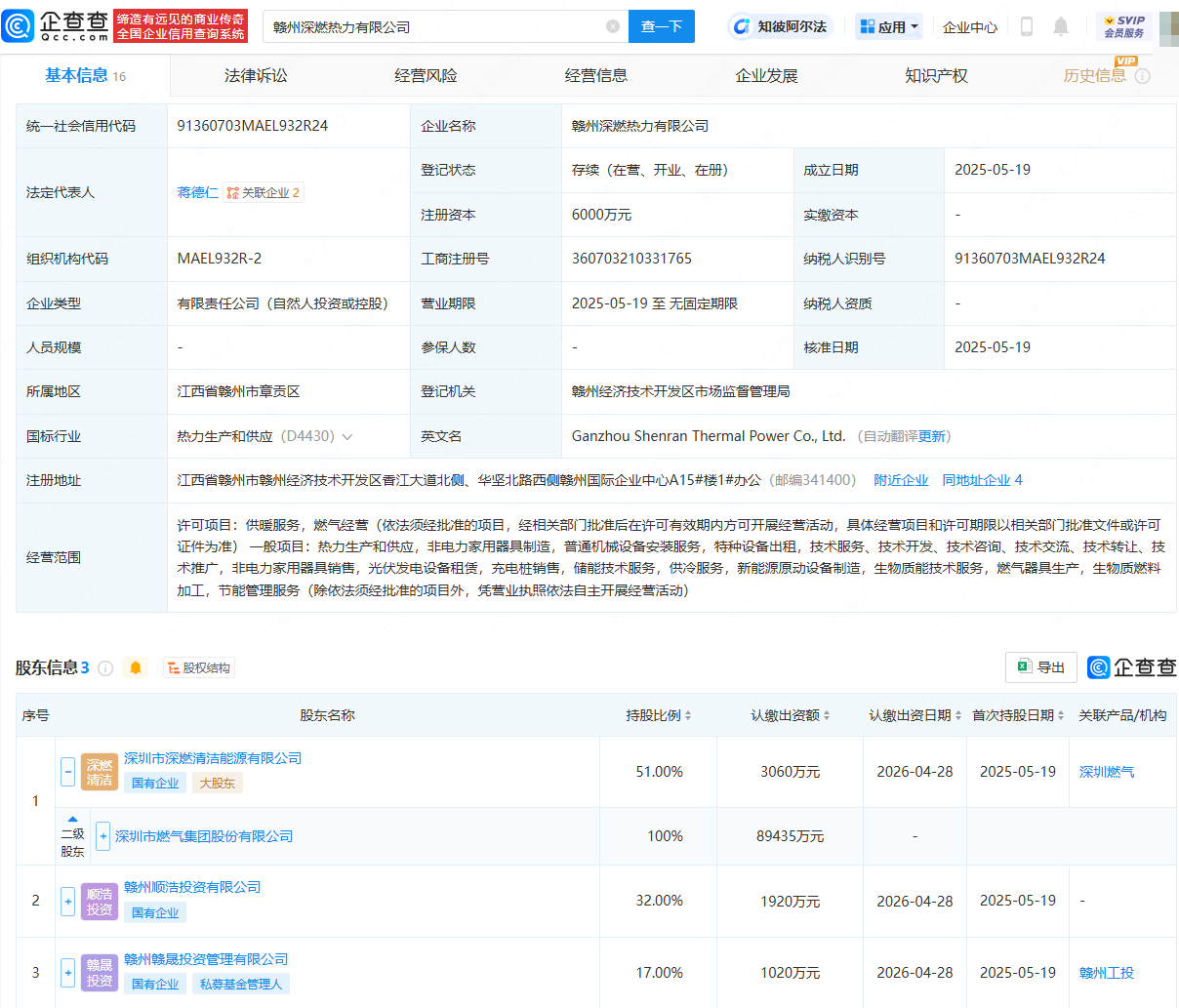 企查查APP显示,近日,赣州深燃热力有限公司成立,法定代表人为蒋德仁,注册资本为6000万元,经营范围包含:供暖服务,燃气经营,非电力家用器具制造,普通机械设备安装服务,特种设备出租,光伏发电设备租赁,充电桩销售,储能技术服务等。企查查股权穿透显示,该公司由深圳燃气(601139)旗下深圳市深燃清洁能源有限公司等共同持股。