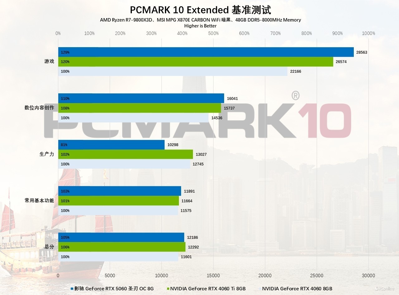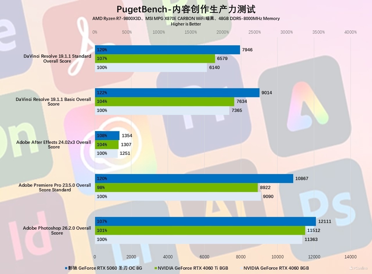 接下来要进行的是图像视频的创作性能测试,影驰 GeForce RTX 5060 圣刃 OC 8GB 依旧延续了游戏领域的巨大提升,再度展现出显著的代际优势。首先通过 PCMark 10 Extended 综合测试可见,其在游戏性能与数位内容创作场景中的表现尤为突出:相较 RTX 4060 领先幅度达 12%-31%,面对更高定位的 RTX 4060 Ti 亦实现约 10% 的性能提升。值得注意的是,其生产力项目得分暂时偏低,推测与现阶段驱动优化尚未完全到位有关。