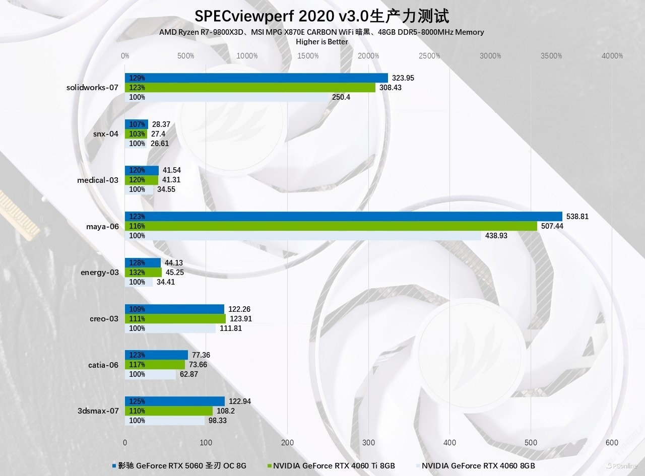 工业级性能测试采用 SPEC2020 基准程序,该测试覆盖多维度工业应用场景。影驰 RTX 5060 圣刃 OC 8GB 在多项子项目中平均领先 RTX 4060 约 20%,部分复杂计算任务的领先幅度更甚;与 RTX 4060 Ti 对垒时,两款显卡在不同专业场景中各有优势,展现出旗鼓相当的综合工业性能,充分证明其不仅适用于消费级市场,也能在轻量化工业设计领域发挥重要作用。