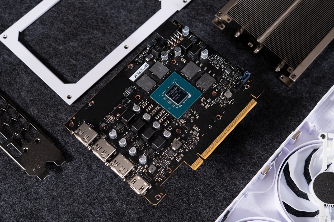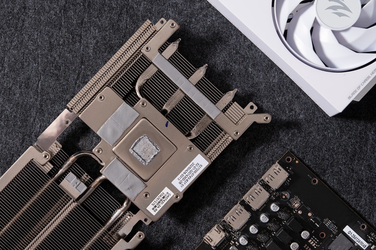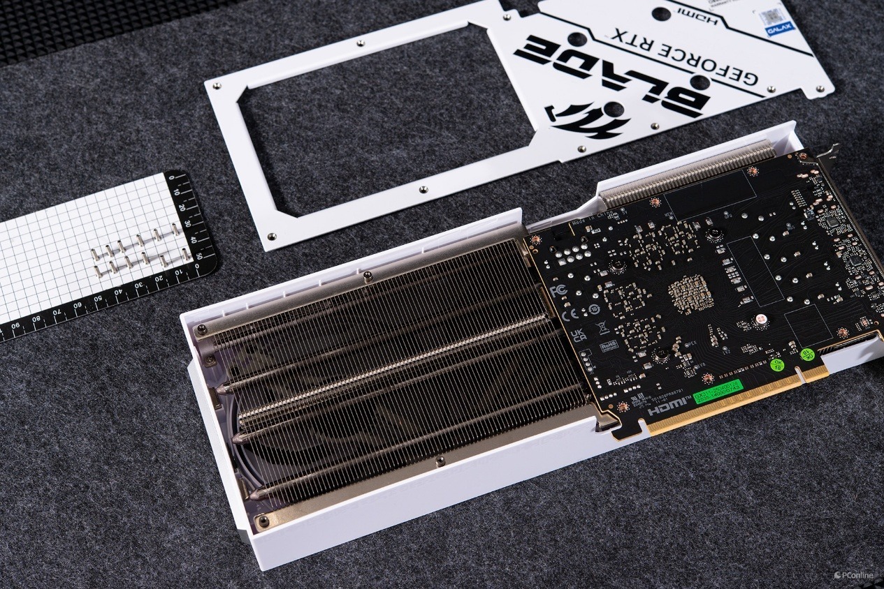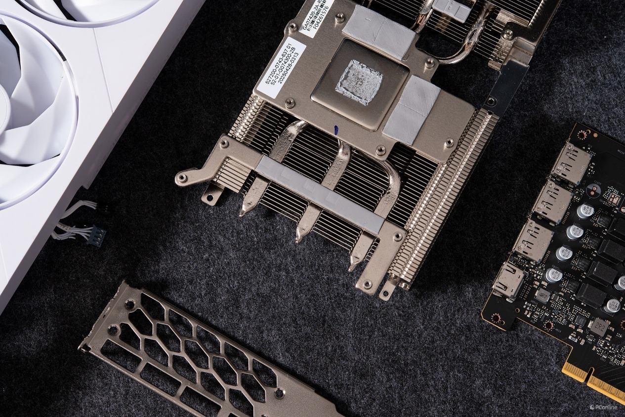 整个显卡散热模组还是非常硕大的,可以分为左右两个部分,左侧是密密麻麻的散热鳍片,配合气流,能够快速带离热量,提升整体冷却效能。散热鳍片之下则藏有3根核心热管,其为GPU核心及显存散热提供了高效的散热保障。
