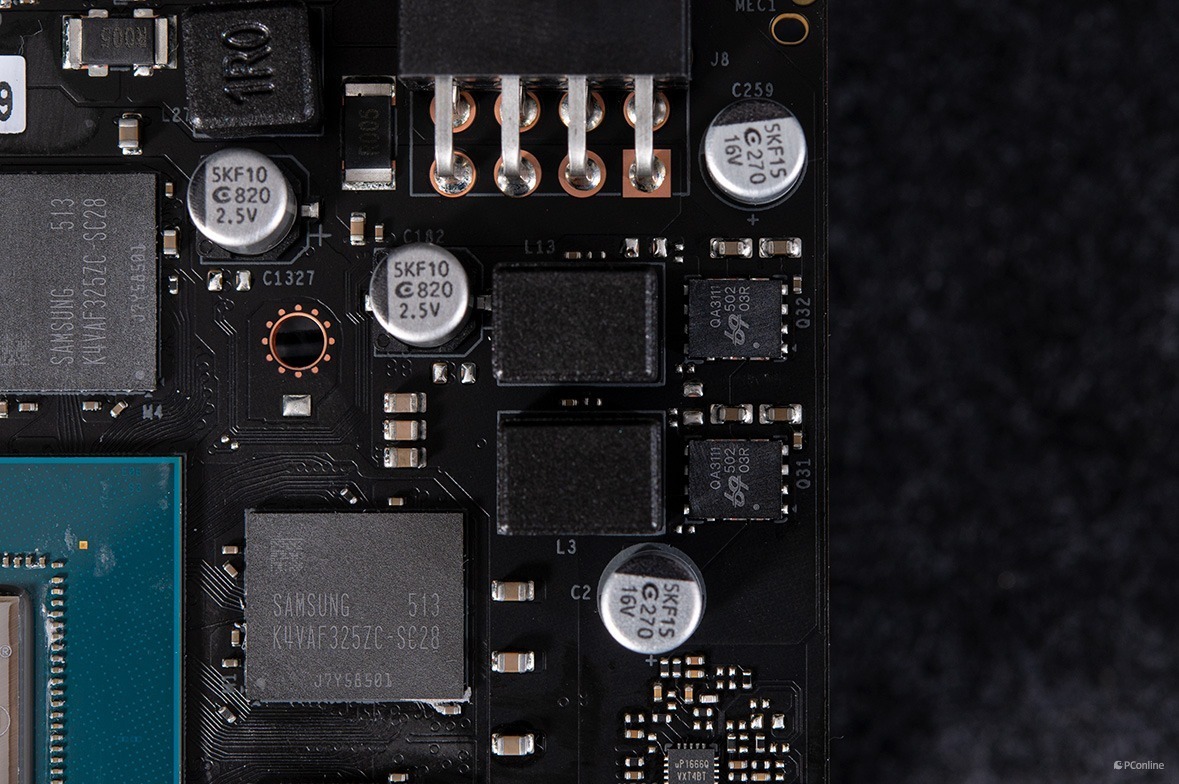 左侧是4相核心供电,每相供电均配上了固态电容、全封闭电感,以及DrMos芯片