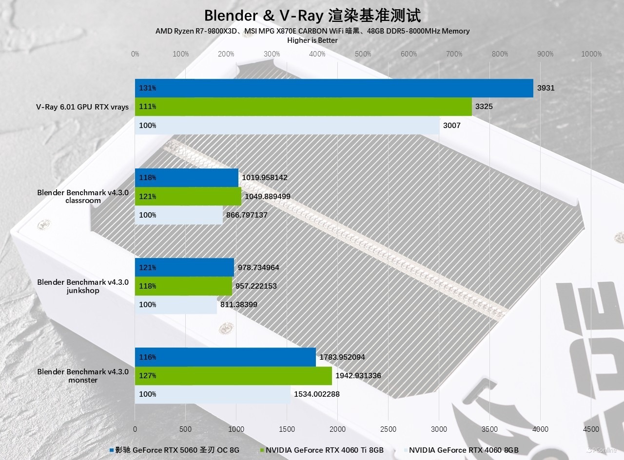 在 3D 渲染创作性能测试环节,影驰 GeForce RTX 5060 圣刃 OC 8GB 继续展现出强劲实力。首先在 Blender 与 V-Ray 两款行业主流软件中,其表现令人瞩目:Blender 渲染测试中,该显卡较 RTX 4060 领先约 20%,面对定位更高的 RTX 4060 Ti 也能保持势均力敌的竞争态势;而在 V-Ray 渲染测试中,影驰 RTX 5060 圣刃 OC 8GB 实现压倒性优势,对比 RTX 4060 领先幅度超过 30%,相较 RTX 4060 Ti 亦有 20% 的显著优势。