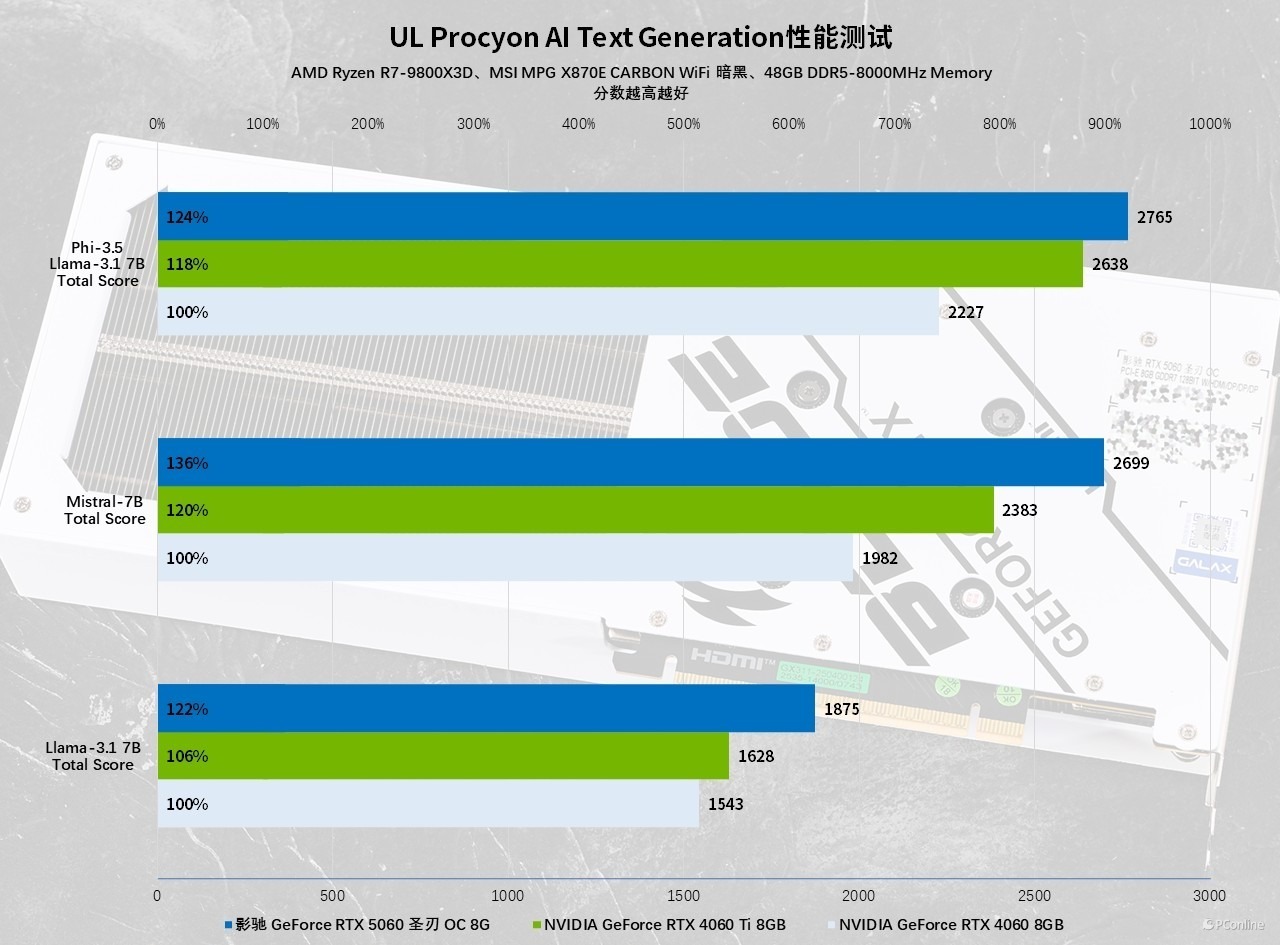进一步通过 UL Procyon 的 AI Text Generation 测试平台,对更多大语言模型进行性能验证,影驰 GeForce RTX 5060 圣刃 OC 8GB 延续了强劲表现:综合性能较 RTX 4060 提升约 27%,面对更高定位的 RTX 4060 Ti 也保持着 13% 的领先优势,全面彰显了 RTX 50 系显卡在 AI 推理与生成任务中的架构优势和优化成果。