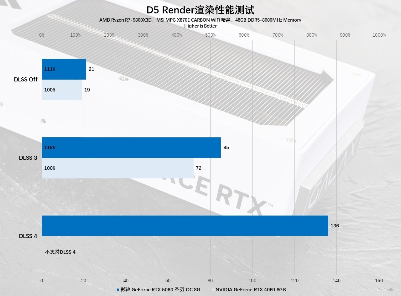 见识完Transformer模型的魅力以后,我们再来看DLSS 4的性能表现,毕竟是“显卡杀手”,对显卡的压力确实不一般,在最高画质+路径追踪的情况下,影驰GeForce RTX 5060 圣刃 OC 8GB只能跑20 FPS,果然全景光追的压力不容小觑。开启DLSS 3以后,游戏帧数为85 FPS,体感已经非常流畅了。开启DLSS 4以后,影驰GeForce RTX 5060 圣刃 OC 8GB能够做到153 FPS,对比原生分辨率,性能足足提升了7.6倍,这在以前的甜品卡身上,完全不敢相信。