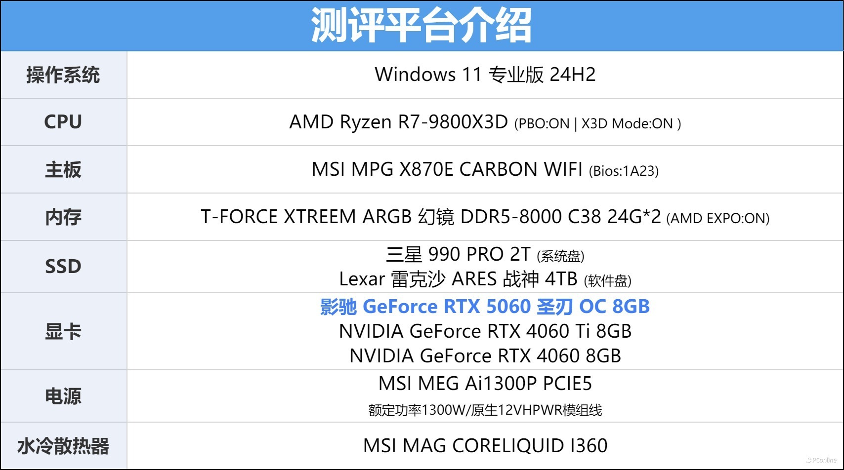 开始性能测试前介绍一下本次的测试平台, CPU使用的是目前毫无争议的游戏神U——AMD Ryzen R7-9800X3D,主板则是来自微星的MPG X870E CARBON WIFI 暗黑主板。内存为G.Skill的幻锋戟Z5 RGB DDR5,在这块主板上能轻松达成DDR5-8000 C38的成绩,并且我们这次选用的是24G×2的套条,确保这张显卡能够释放全部性能。