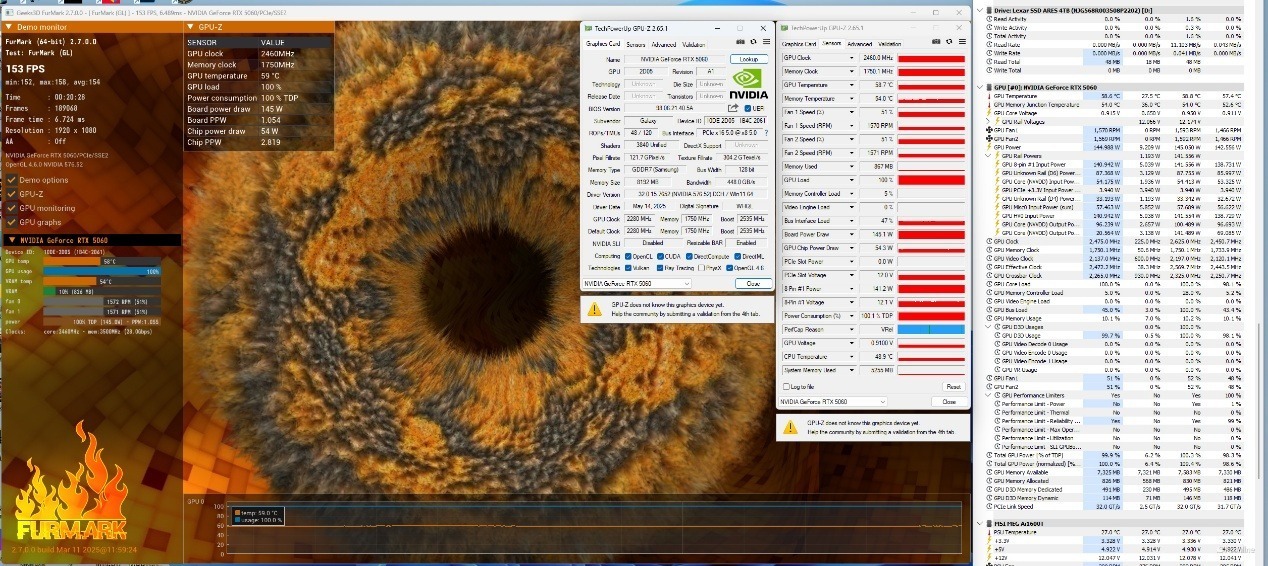 评测的最后一项是烤机测试,得益于影驰 GeForce RTX 5060 圣刃 OC 8GB出色的散热配置,整体表现非常出色。在室温20℃下,Furmark烧机10分钟后,整张显卡的温度并不高,核心与显存温度都低于60度,非常凉快。显卡的最大功率则为145 W,风扇转速则是1570 RPM,噪音与温度控制优秀。