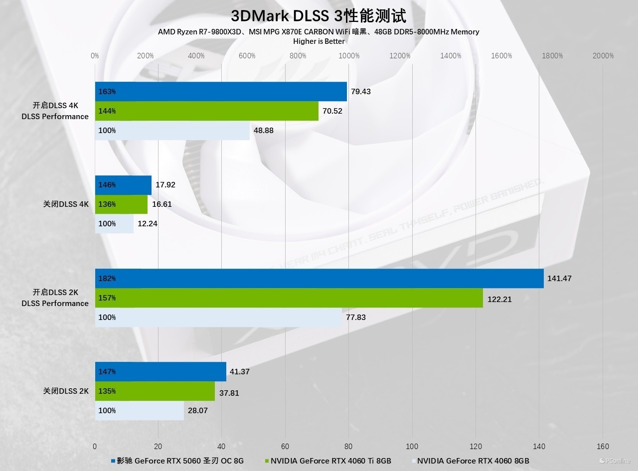 首先是3DMark的DLSS 3性能测试。影驰GeForce RTX 5060 圣刃 OC 8GB在2K分辨率下,对比RTX 4060,性能提升幅度非常夸张,达到了82%,对比RTX 4060 Ti则是25%;4K分辨率下,开启DLSS 3以后,对比RTX 4060性能领先也基本维持在80%以上,而对比RTX 4060 Ti同样拉开了不小的差距,接近40%的性能提升只能说老黄确实有点东西。