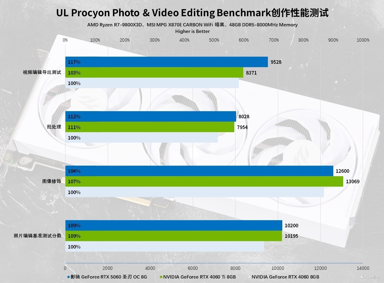 图像编辑与视频创作环节我们则采用 UL Procyon 进行测试:在图像编辑任务中,影驰 GeForce RTX 5060 圣刃 OC 8GB 与 RTX 4060 Ti 表现旗鼓相当,而对比 RTX 4060 则保持 9% 的性能优势;进入视频剪辑场景,该显卡的优势进一步放大,相较 RTX 4060 和 RTX 4060 Ti 分别实现 18% 与 15% 的领先。