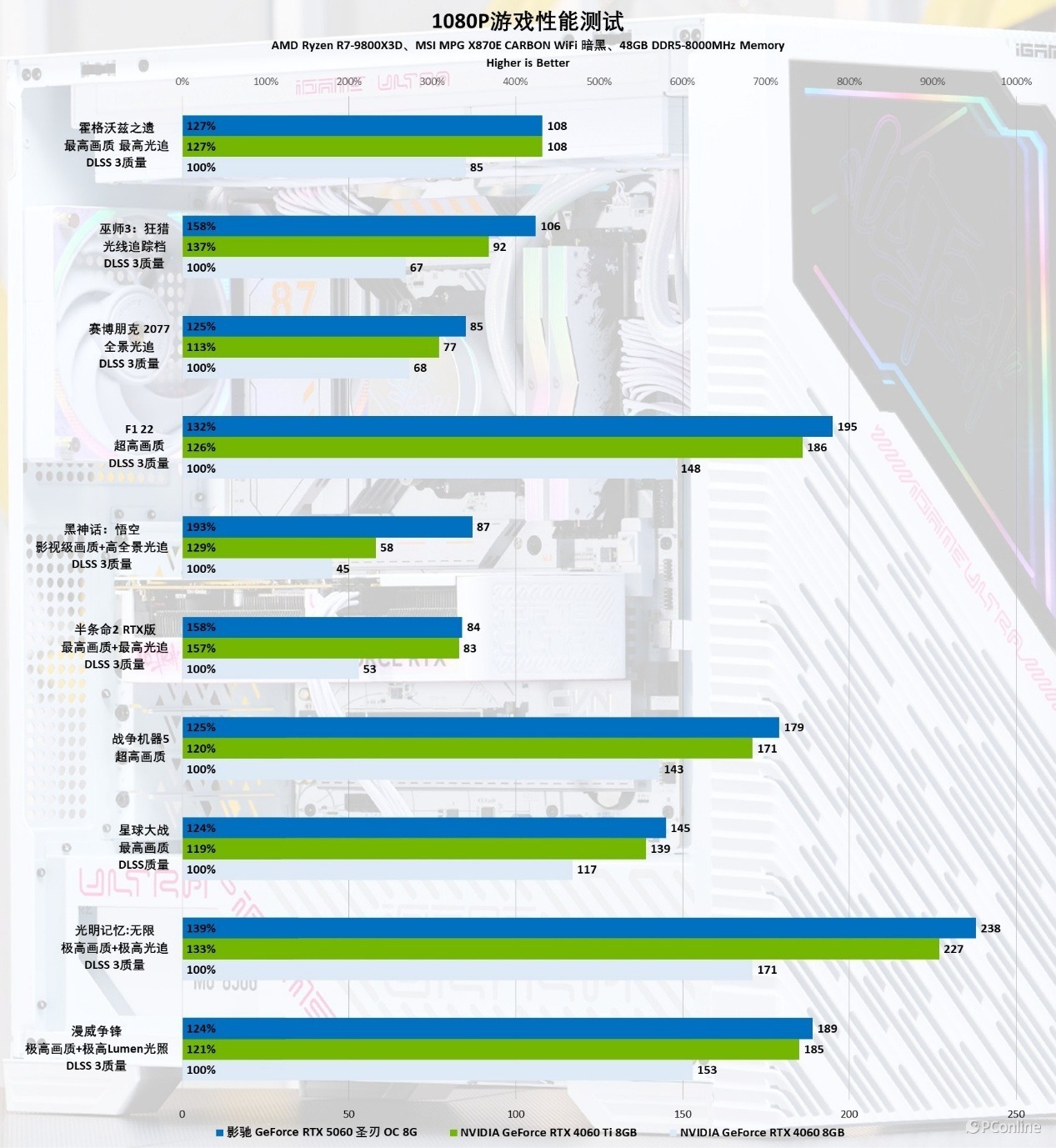 实测,在 1080P 分辨率下,影驰 GeForce RTX 5060 圣刃 OC 8GB 轻松应对所有测试项目,甚至展现出越级挑战 2K 分辨率的实力:《F1 22》《光明记忆:无限》《漫威争锋》等优化出色的作品中,帧率稳定突破 200+ FPS;即便是硬件压力极大的《黑神话:悟空》《赛博朋克 2077》全高设置下,仍能保持 87 FPS 的流畅表现,轻度降低画质即可解锁 144Hz 高刷体验。综合性能方面,影驰 GeForce RTX 5060 圣刃 OC 8GB 在常规游戏性能上整体超越 RTX 4060 约 20%,对比 RTX 4060 Ti 也有近 10% 的性能反超。