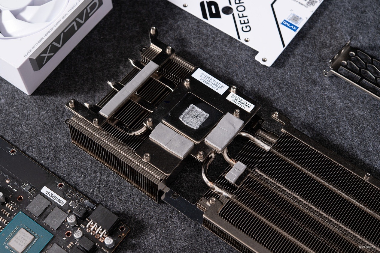 率先映入眼帘的就是正中间这个大面积且非常厚实的镀镍铜底座。四周是影驰为显存、电感等部件准备的高导热系数的导热垫。