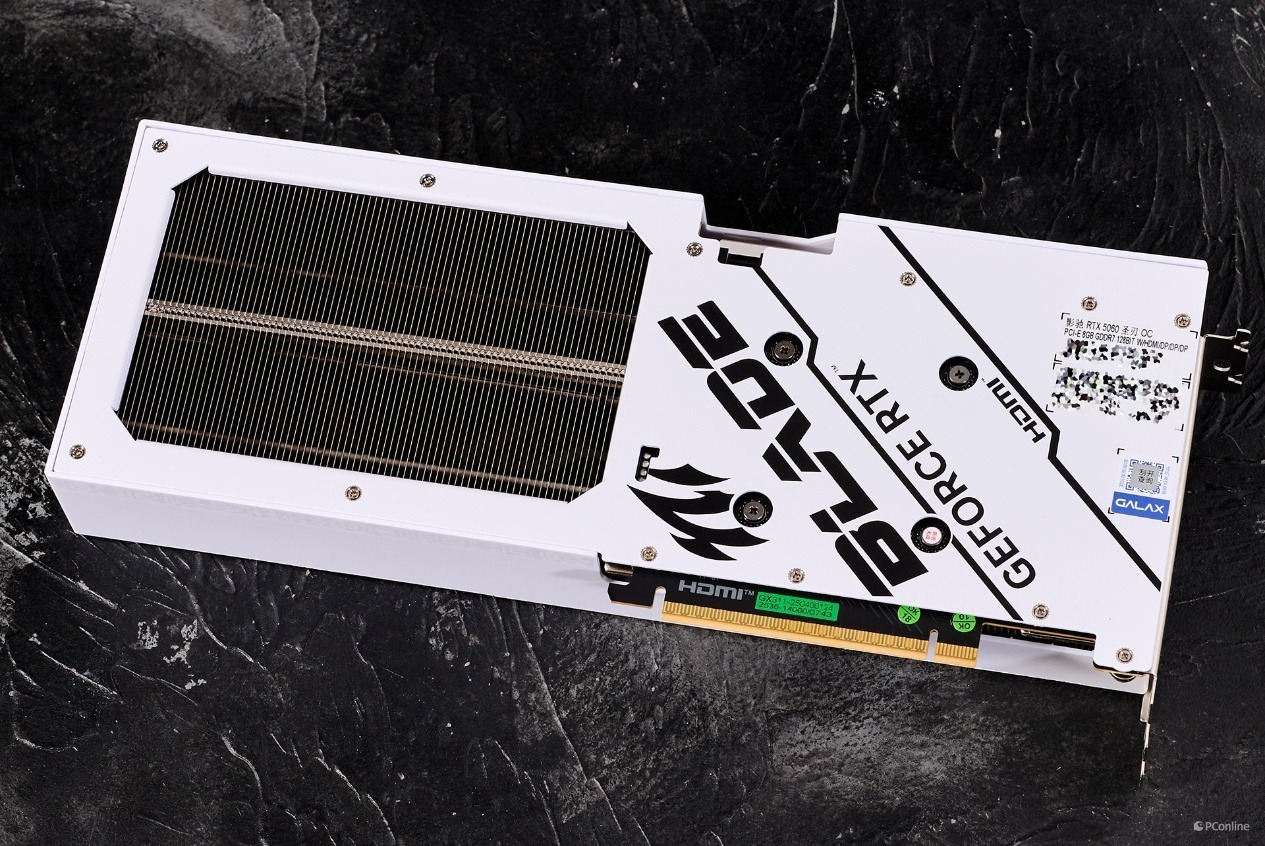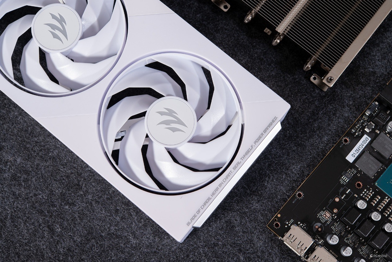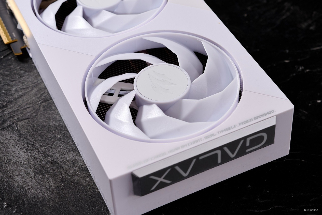 接下来让我们看看这款显卡的真面目,外观设计方面,影驰GeForce RTX 5060 圣刃 OC 8GB与之前的圣刃系列显卡几乎一样,纯白的导风罩,周边配有一些符咒等符号进行点缀,具备很高的视觉辨识度。
