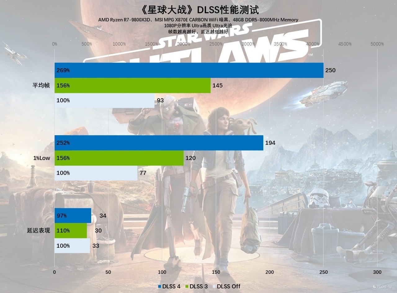 第四款游戏我们测试的是《星球大战》,一样你能在设置中看到其帧生成功能已经支持×4的选项,也就是DLSS 4多帧生成功能。