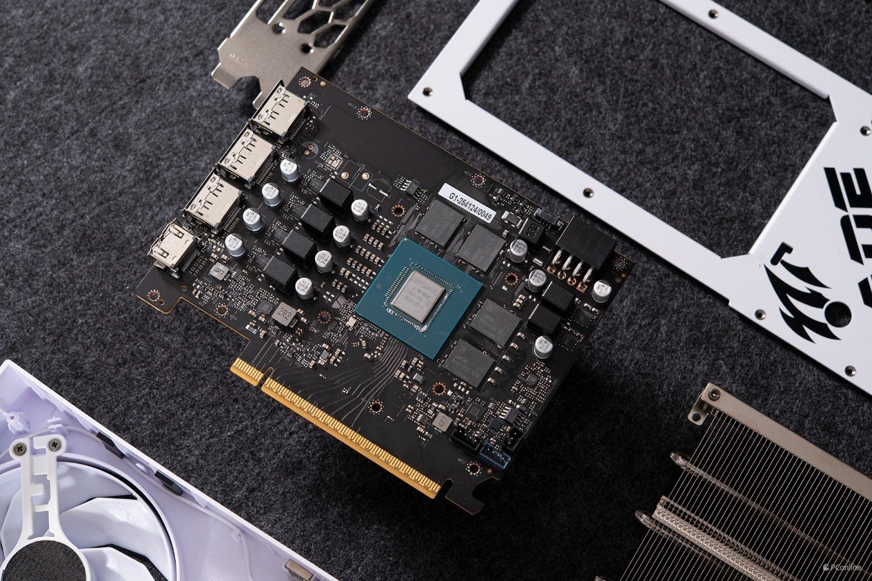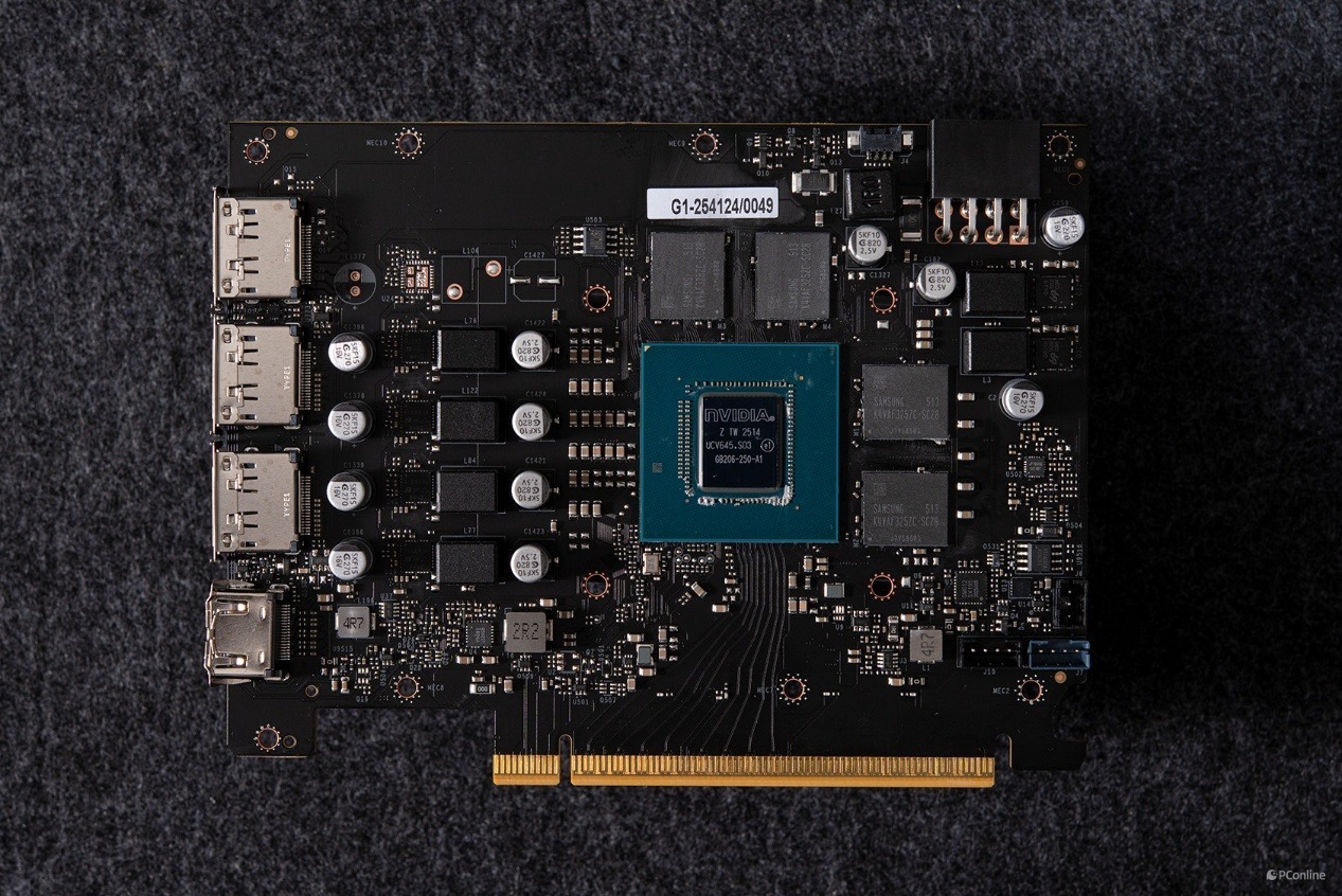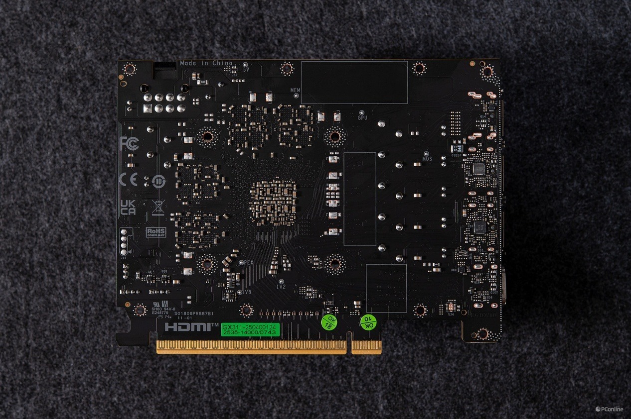 拆开后先看看显卡的PCB设计。与之前的RTX 5060 Ti类似,影驰GeForce RTX 5060 圣刃OC 8GB的PCB完全可以用小巧玲珑来形容。这个尺寸完全可以做成ITX显卡!