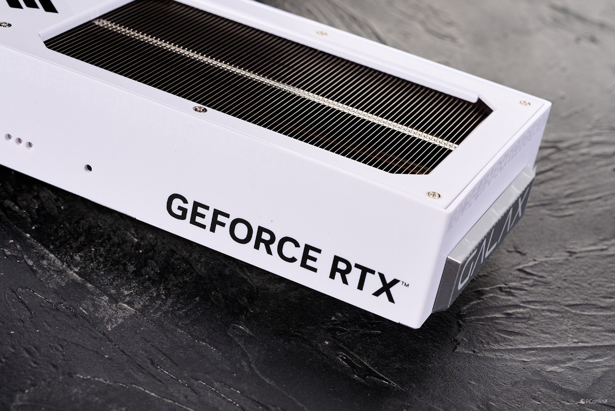 显卡的顶部就比较常规了,中央是磁吸光模块接口,而一侧则是NVIDIA显卡经典的“GEFORCE RTX”标识。