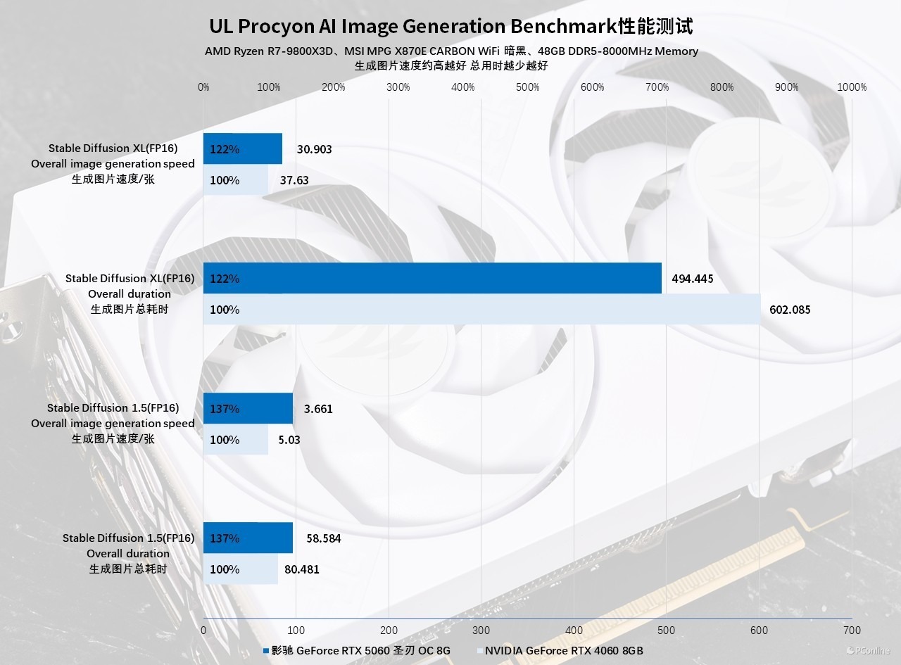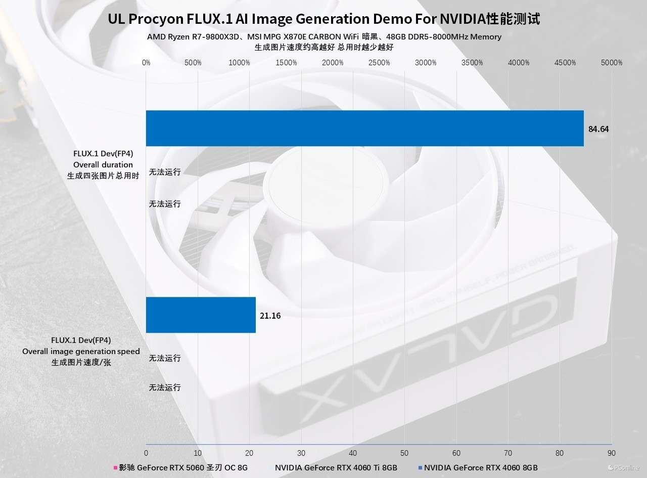 实测数据也印证了这一技术优势:前代两款 60 级显卡受限于显存容量,未能完成测试任务。而配备 8GB 显存的影驰 GeForce RTX 5060 圣刃 OC 8GB,凭借 FP4 精度模型支持,不仅顺利通过测试,在文生图场景中生成单张图片仅耗时 21.16 秒,展现出同级别产品中优异的运算效率。