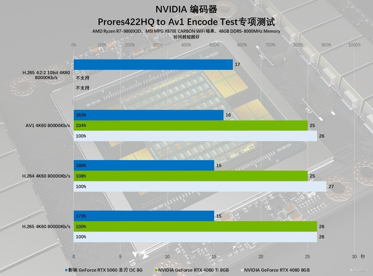 我们采用 NVIDIA 提供的 4K60 片源及工程文件,实测不同编码格式下的导出效率:影驰 GeForce RTX 5060 圣刃 OC 8GB 处理同一段素材时,AV1、H.265、H.264 格式的导出时间分别为 16 秒、15 秒、15 秒,较前代两款同级别显卡效率提升 60%-80%,充分展现了新一代编解码器的强大性能。