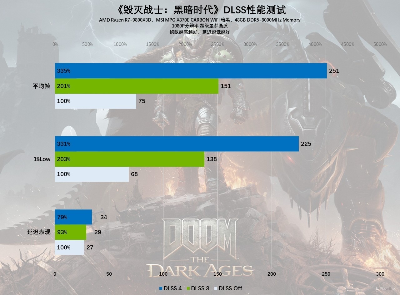 最后一款游戏我们测的是最近刚支持DLSS 4的《毁灭战士:黑暗时代》,实测影驰GeForce RTX 5060 圣刃 OC 8GB在1080P分辨率、超级噩梦画质下,表现还是非常不错的,即便不开启超分,也能流畅游戏;开启DLSS 3质量档后,游戏帧数已经能够满足高刷需求了,接着启动DLSS 4质量档后,游戏帧数更是来到了250 FPS以上,完全的爽玩水准。