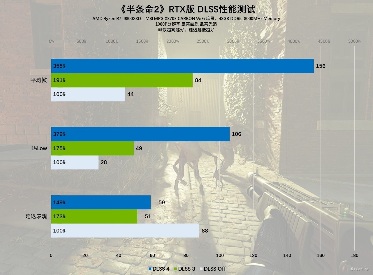 实测下来,只能说《半条命2》RTX版对硬件的开销极大,在原生1080P分辨率下,所有画质、光追均开至最高,不开启超分选项时,影驰GeForce RTX 5060 圣刃 OC 8GB帧数为44 FPS。在开启DLSS 3质量档以后,游戏帧数来到了84 FPS,几乎快摸到高刷的门槛了,而继续开启DLSS 4质量档,游戏帧数飙升至156 FPS,对比原生1080P的表现,性能提升高达3.5倍!1%Low的表现也差不多,领先幅度接近4倍。