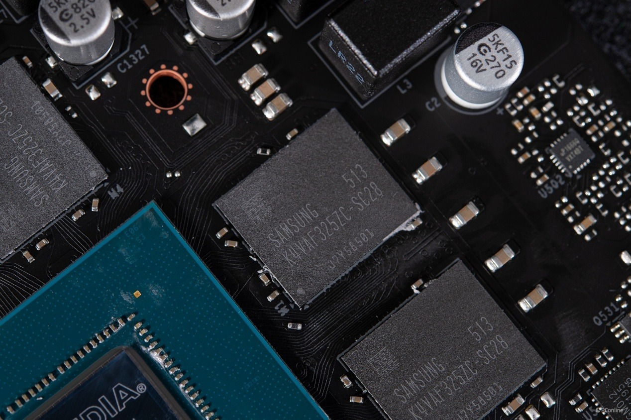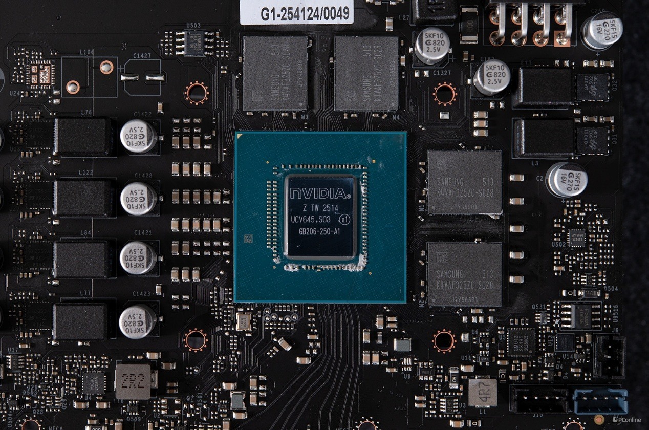 核心的四周则被4颗显存芯片包围,规格上是GDDR7,由三星提供,单颗2GB,共8GB。显存型号为K4VAF325ZC-SC28,内部是512M×32的架构,根据其型号后缀“SC-28”也可以知道,这些显存的数据频率可达28Gbps。
