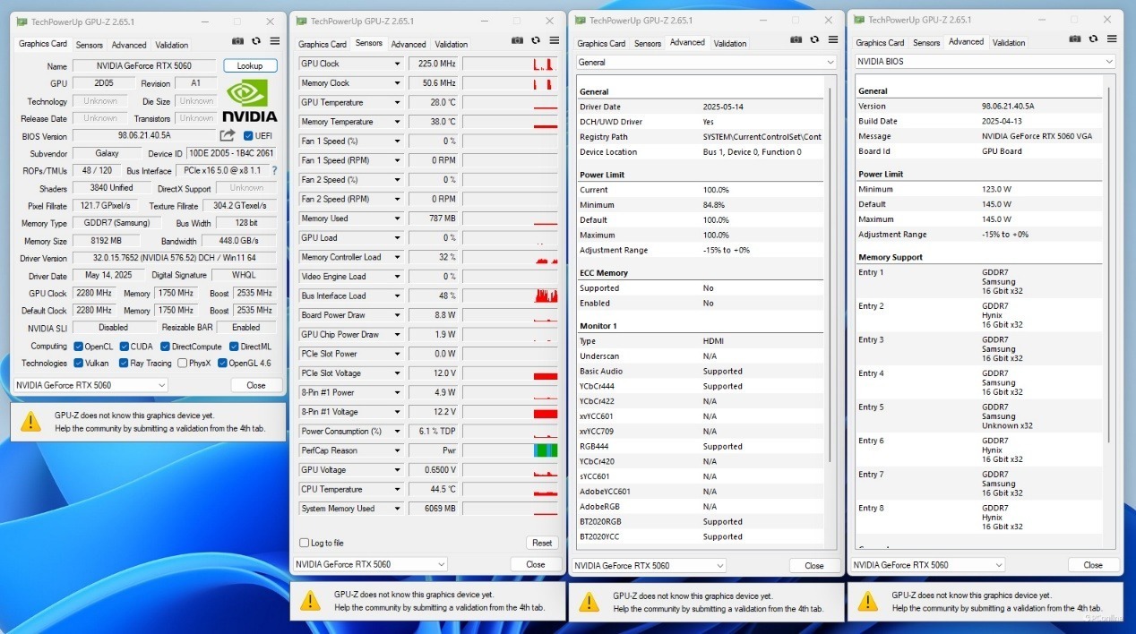 开始测试前,照例还是要“认识”一下这张显卡。从GPU-Z的信息中可以看到影驰GeForce RTX 5060 圣刃 OC 8GB的基准频率为2280 MHz,Boost频率为2535MHz,毕竟是带着OC后缀的型号,其Boost频率对比MSRP版本的RTX 5060要高出不少,由2497 MHz提升到了2535MHz,这也意味着其性能释放更强劲一些。除此之外,这张显卡的TDP也比前代稍高一些,为145 W。并且换装了更高级的GDDR7显存,能够带来448 GB/s的显存带宽,对比前代的272 GB/s提升明显。