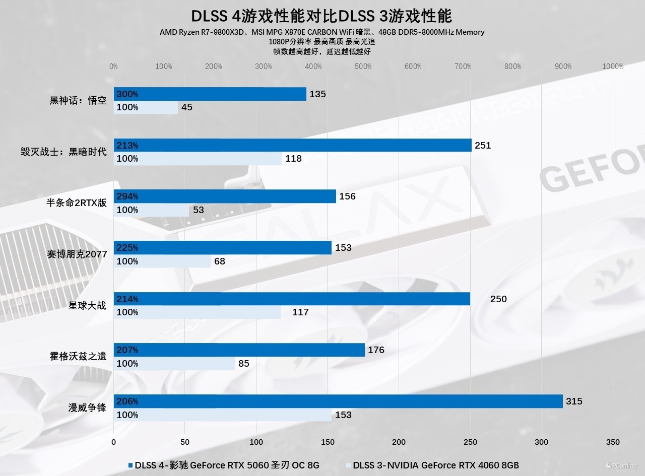 要说最惊喜的肯定是它的性能释放表现,实测数据显示,影驰 RTX 5060 圣刃 OC 8GB 在常规游戏性能上全面超越前代 RTX 4060 约 20%,甚至对比 RTX 4060 Ti 也有近 10% 的反超。而在 DLSS 4 多帧生成技术的加持下,其性能更是有跨越式提升:在《赛博朋克 2077》《黑神话:悟空》等硬件杀手级游戏中,开启 DLSS 4 后帧数较原生分辨率提升 3-7 倍,DLSS 4 的 Transformer 模型还能带来画质升级,实现 “帧数与画质兼得” 的体验。