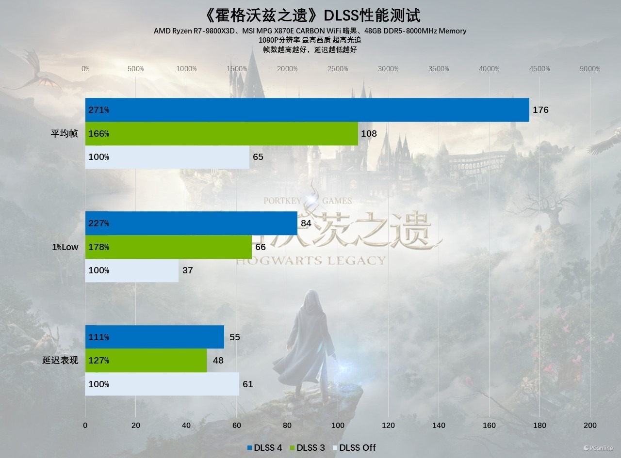 实际测试过程中,我们发现《霍格沃兹之遗》这款游戏优化还是不错的,1080P分辨率画质光追均设置最高的情况下,影驰GeForce RTX 5060 圣刃 OC 8GB在不开任何超分的情况下,平均帧为65 FPS。如果开启DLSS 3质量档,此时帧数已经能够做到108 FPS了,属于是高刷与画质的完美组合,体验相当丝滑。开启DLSS 4以后,帧数可以进一步提升至176 FPS,对比原生1080P的表现,性能提升了约3倍左右。