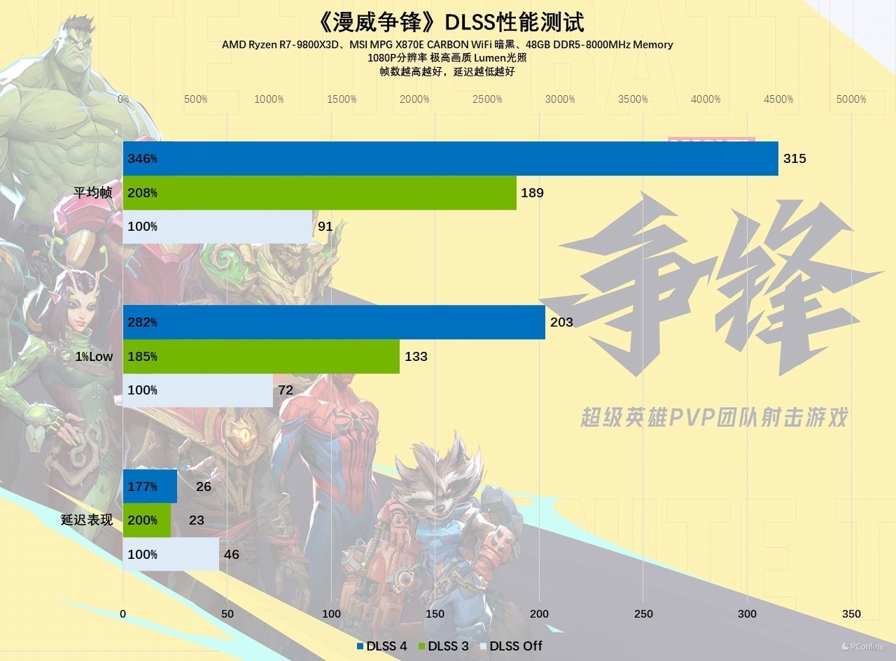 网游方面我们测的是《漫威争锋》,这款游戏在RTX 50系显卡首发之时,它还没有完全适配DLSS 4,玩家想要体验多帧生成功能还需要依靠NVIDIA App的DLSS 4优设功能。不过现在《漫威争锋》也正式支持DLSS 4了,与上面的游戏一样,玩家在游戏设置中就能直接开启,并且提供了2x、3x以及4x选项,玩家可以随意选择是插一帧、插两帧还是插三帧。