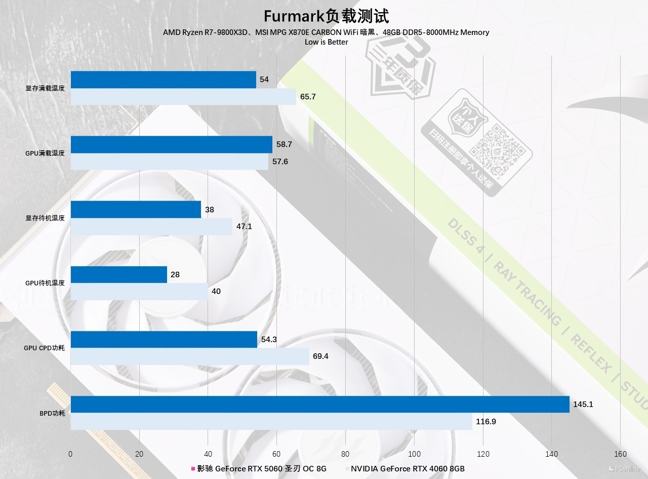 接着我们再横向对比一下前代显卡,虽然新显卡的TDP提升了,不过整体的烤机功耗并不算高,影驰 GeForce RTX 5060 圣刃 OC 8GB整体的散热效果极其出色,待机时温度甚至比115W的RTX 4060还要低,属于是非常惊喜了。