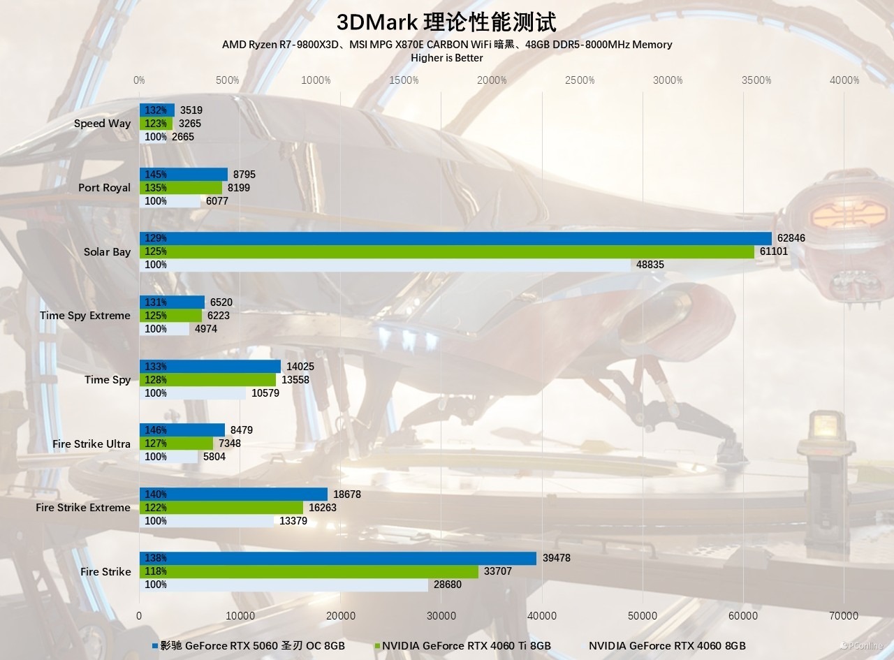在理论性能测试 3DMark 中,影驰 GeForce RTX 5060 圣刃 OC 8GB 在 Fire Strike 系列测试里的表现相当出色。在 1080P 分辨率下,相比 RTX 4060 能领先大概 38%,和 RTX 4060 Ti 对比也有 20% 左右的性能提升;来到 2K 分辨率,它领先 RTX 4060 约 40%,比 RTX 4060 Ti 高出约 18%;而到了 4K 分辨率,优势更为明显,对比 RTX 4060 有 46% 的提升,对比 RTX 4060 Ti 也有 19% 的领先幅度。