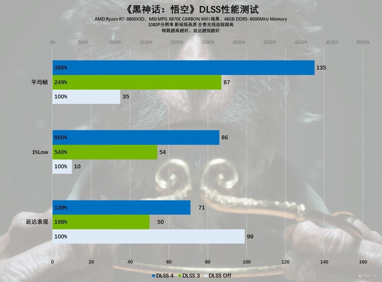 我们在1080P下将画质调整至影视级,全景光追也拉到最高,此时影驰GeForce RTX 5060 圣刃 OC 8GB在不借助任何超分技术的条件下,游戏帧数仅有35 FPS。而有DLSS 3的帮助后,游戏帧数也回到了流畅的水准87 FPS;这时如果你有RTX 50系显卡,开启DLSS 4多帧生成以后,游戏帧数将再度飞跃,135 FPS的表现相当夸张,对比原生分辨率提升了快4倍,直接由可玩变爽玩了。