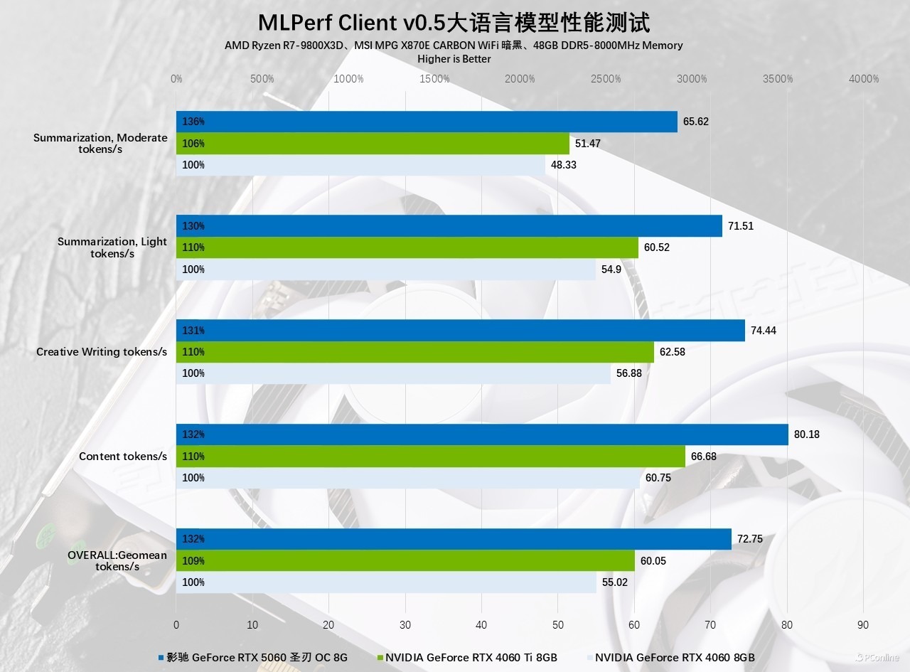 转向本地大模型部署场景,我们基于 meta 开源的 Llama 2 7B 大语言模型,通过 MLPerf Client v0.5 进行四项典型 AI 任务测试,涵盖内容生成、创意写作及不同长度文本的摘要总结。影驰 GeForce RTX 5060 圣刃 OC 8GB 在所有测试项目中均展现出压倒性优势:对比 RTX 4060 Ti 性能提升 20%,相较 RTX 4060 更是实现 30% 的大幅领先。