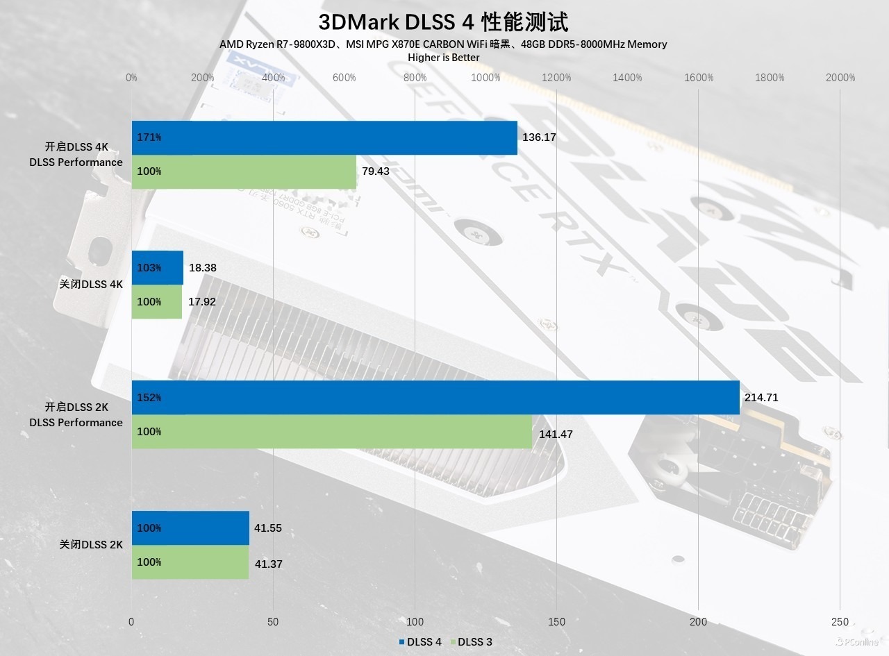 简单介绍完,我们再看看DLSS 4的理论表现如何,在 3DMark DLSS 4 专项测试中,影驰 GeForce RTX 5060 圣刃 OC 8GB 展现出颠覆性性能提升:2K 分辨率下,开启 DLSS 4 前后的帧数差距达到4 倍,而4K 分辨率下更是达到了夸张的7 倍性能鸿沟。
