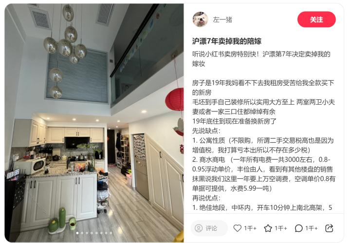 2024年7月底,左伊在社交平台上发布了一条卖房笔记,意外大爆,吸引不少潜在买家咨询。
