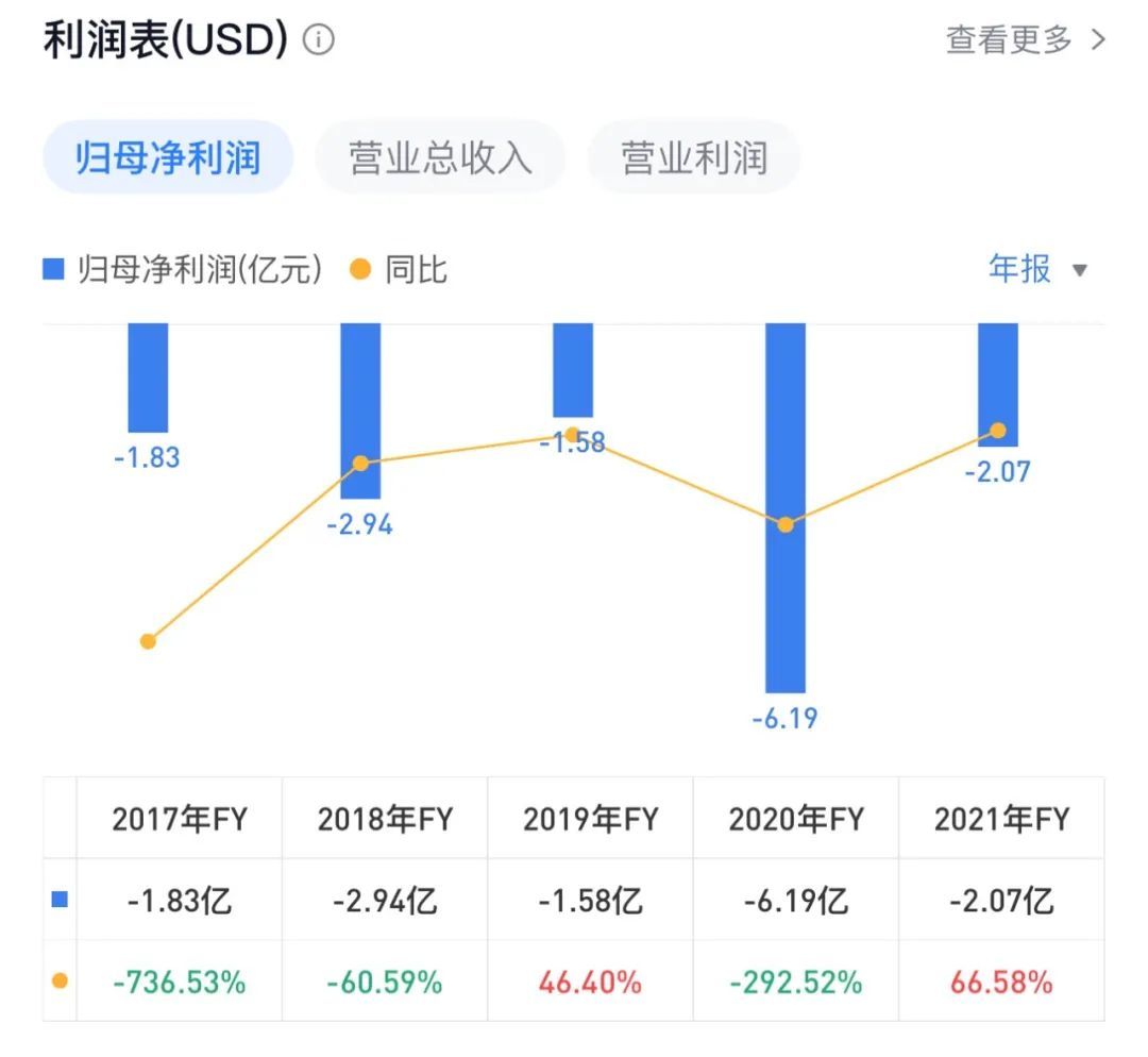 其中,在2020年,营业收入为19.04亿美元(约合人民币137.08亿元),较2019年下滑21.30%,净利润亏损6.19亿美元(约合人民币44.57亿元),亏损扩大到292.52%。