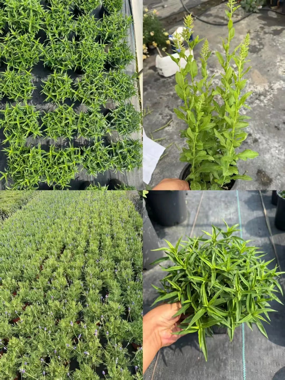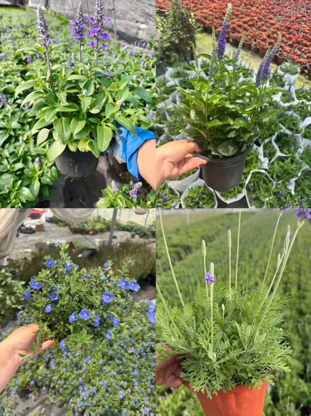 如果你喜欢上面这些蓝色系的花,可以和花友一起团,最近基地有活动,包括蓝雪花、薰衣草、鼠尾草和蓝星花都是9.9元/盆;婆婆纳12.8元/盆;龙胆花13.8元/盆;都是16厘米口径的带花盆栽苗,下面有基地的实拍图(发货时的状态)。
