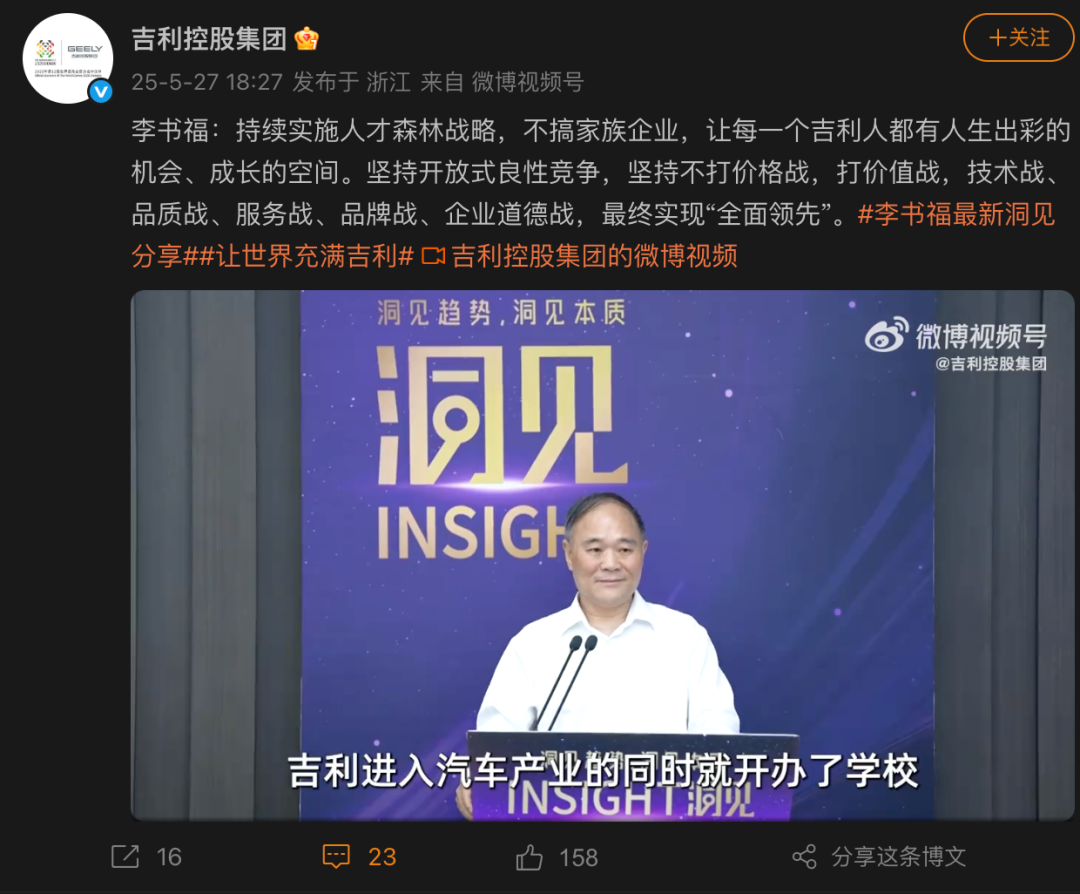 5 月 27 日消息,吉利控股集团官方账号今日发布了吉利控股集团董事长李书福讲话视频。
