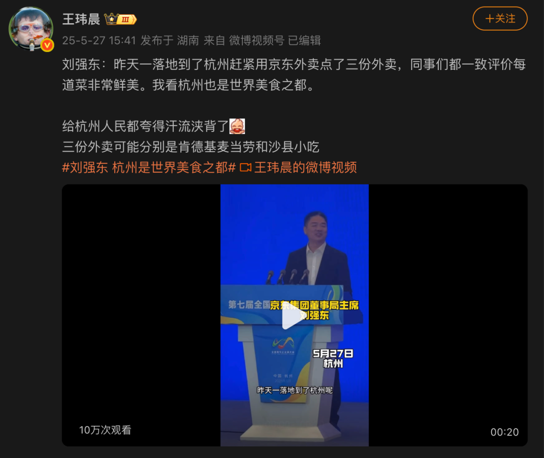 此外,刘强东再次「带货」自家的京东外卖业务,表示一落地到了杭州赶紧在京东外卖点了 3 份外卖,同事们都一致评价每道菜非常鲜美,并在谈到网传「杭州是美食荒漠」时表示「我看杭州也是世界美食之都」。