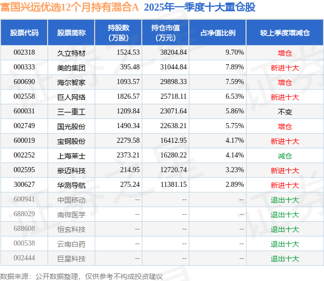 富国兴远优选12个月持有混合A的前十大重仓股如下: