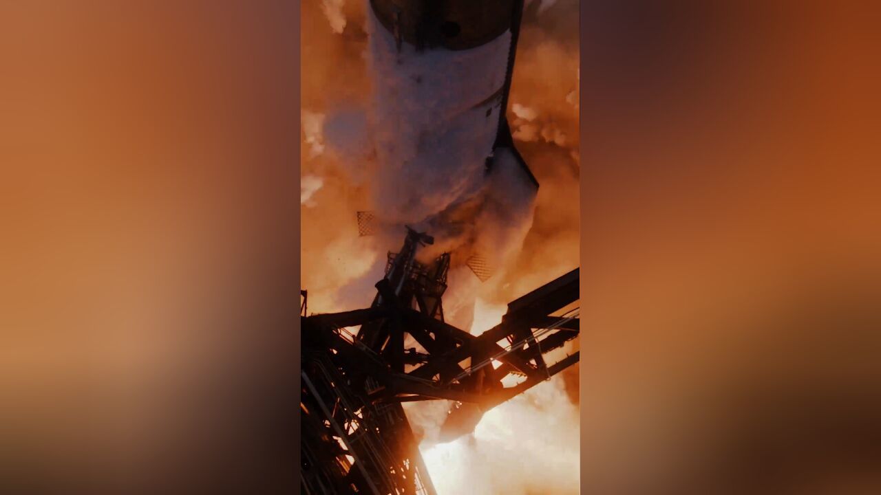2024年10月13日,星舰进行第五次测试飞行。在星舰发射约6分50秒后,发射塔架上的捕获装置首次成功抓住了从天而降的几百吨重的助推火箭,这是人类首次用这种方式回收火箭,网友形象地称之为“筷子夹火箭”。