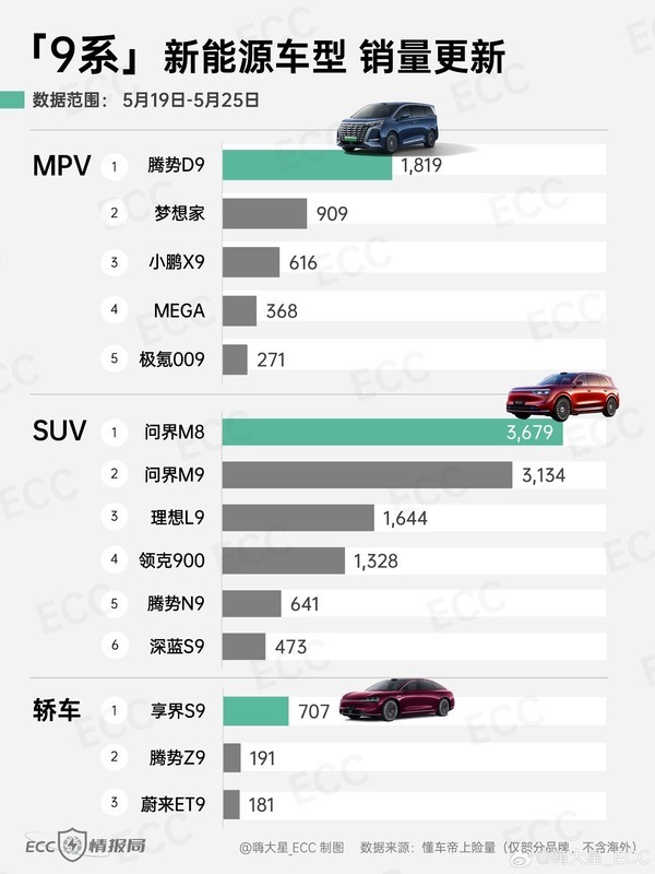 【CNMO科技消息】根据最新销量数据,2025年5月19日至25日期间,国内“9系”新能源车型市场呈现多元化竞争格局(注:“9系”代指车长5.2米左右及以上的大型车)。其中,SUV车型问界M8以3679辆的销量登顶榜首,MPV车型腾势D9则以1819辆的成绩领跑该细分市场。轿车类别中,享界S9以707辆的销量占据领先地位。