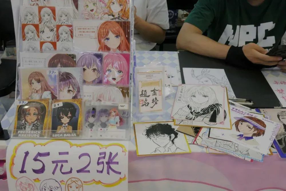 “十五元两幅(绘画打印稿明信片)”。库里的绘画摊位,在谷子摊位中显得格外显眼。