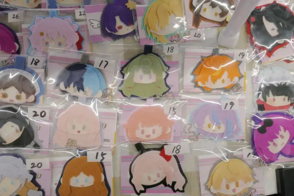 谷子集市开始营业前,她们早早到达地王广场摊位,从楼下仓库搬来一堆让年轻人疯狂的小物件,前排最显眼的位置放着畅销乙游男主的不织布制品,其余的按IP分类摆放。