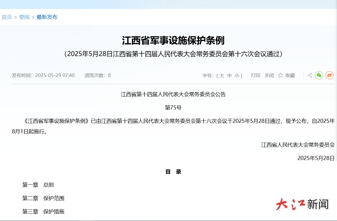 大江网/大江新闻客户端讯 全媒体记者王琴红报道:家人们注意了!在江西,军事设施保护有了新“规矩”。5月28日,江西省第十四届人民代表大会常务委员会第十六次会议通过了《江西省军事设施保护条例》(以下简称《条例》),明确自2025年8月1日起施行。《条例》从保护范围、保护措施、协作共管、法律责任等方面作出详细规定。像无人机乱飞、破坏保护标志这些行为,不仅要罚款,严重的还将依法追究刑事责任。