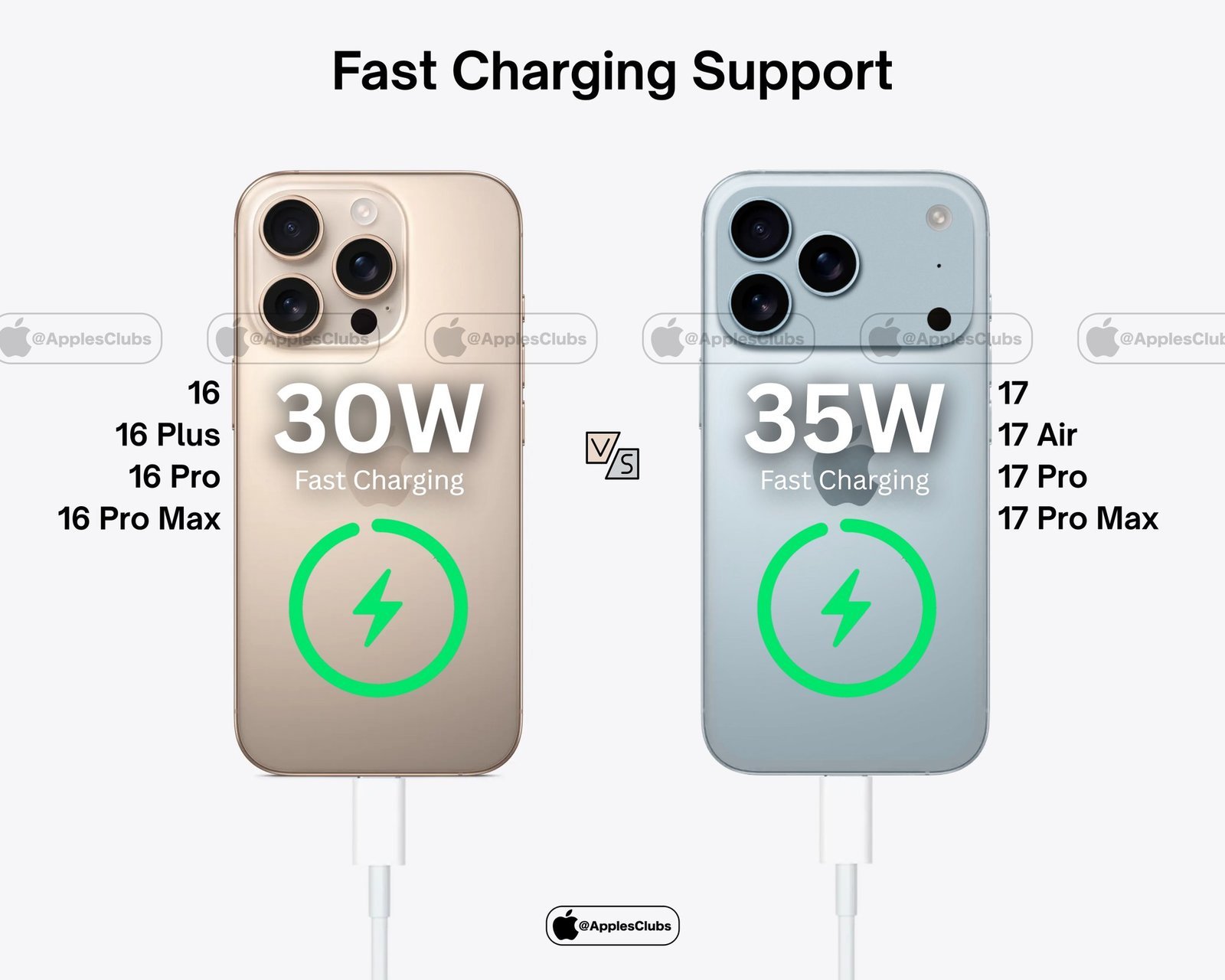 除了外观变化以外,根据目前爆料信息,iPhone 17系列有线充电还有望提升到35W。